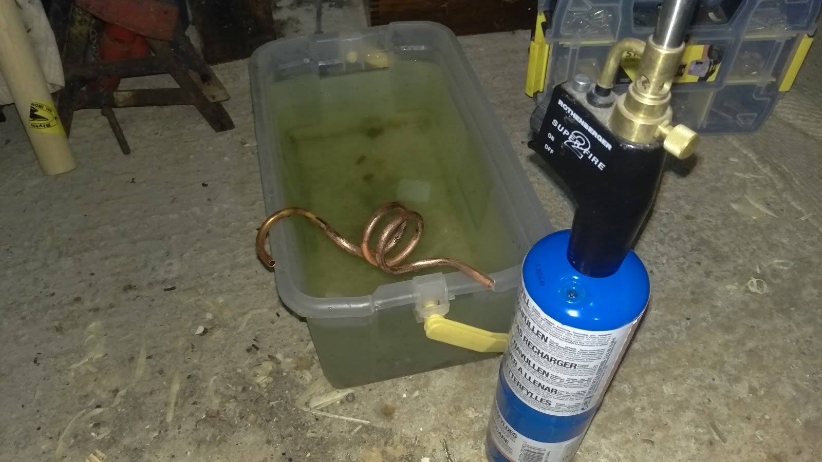 Next step, before soldering the nipples on, is to anneal the pipe - in other words to remove the work hardening stresses that have built up during bending - I am sure you noticed it got stiffer after bending? You don't want to leave the pipe in that state, because it is going to bend a little in service, through vibration, and this will make it harder still eventually leading to a fatigue failure.