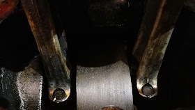 A look at the flywheel reveals this is the earlier, smaller, built up crank used until 1958 - perhaps not surprising in that this engine is marked 'LF' and is clearly a 1955 design. The crank has no radial bolts in the flywheel like the later 'large bearing' cranks.